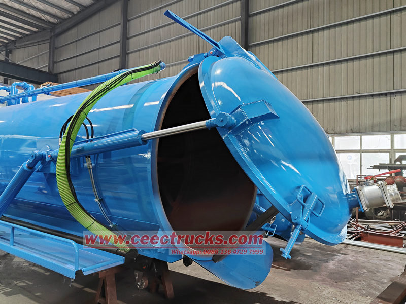 Вакуумски систем, који укључује вакуум пумпу и сепаратор нафте и гаса, користи негативни притисак за извлачење отпада. Склоп резервоара је направљен од високочврстог, отпорног на корозију челика и има инспекциони прозор и отвор за складиштење отпадних вода. Систем цеви, укључујући усисне и испустне цеви и контролни вентил, одговоран је за пренос медија. Вакуумска цистерна монтирана на камион Хидраулични систем подиже резервоар и отвара задњи поклопац, олакшавајући испуштање отпадних вода. Управљачка платформа је опремљена контролним дугмадима и манометром за праћење у реалном времену.