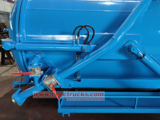 ♦ Када је резервоар пун, оператер пребацује вентил на позитивни притисак, омогућавајући испуштање отпада под притиском. Опремљен хидрауличним системом за подизање, резервоар се може нагнути ради гравитационог истовара.
