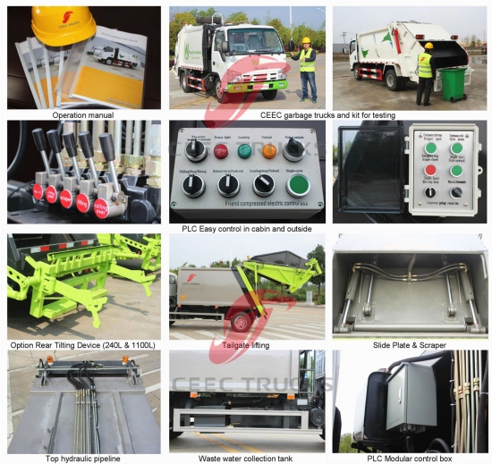 Европски стандард компримовани камион за смеће од 12000 литара, који користи тело компактора од челичног материјала високе чврстоће, ПЛЦ модел за контролу увоза, уређај за контролу хидрауличног цилиндра, контролну кутију на енглеском језику за лак рад