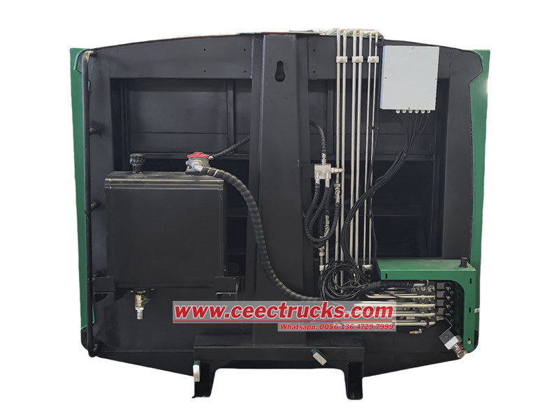 Каросерија камиона за сакупљање отпада од 12 кубних метара је заварена од челичних плоча високе чврстоће, са интегрално обликованим бочним панелима и заобљеним обликом за издржљиву и чврсту структуру. Унутрашњост је посебно обрађена за спречавање рђе и опремљена је високоефикасним механизмом компресије, значајно смањујући запремину отпада и повећавајући капацитет терета. Чврсто заптивање спречава цурење отпада и мирисе. Горњи део каросерије је кутија од 12 кубних метара са три режима утовара и истовара.