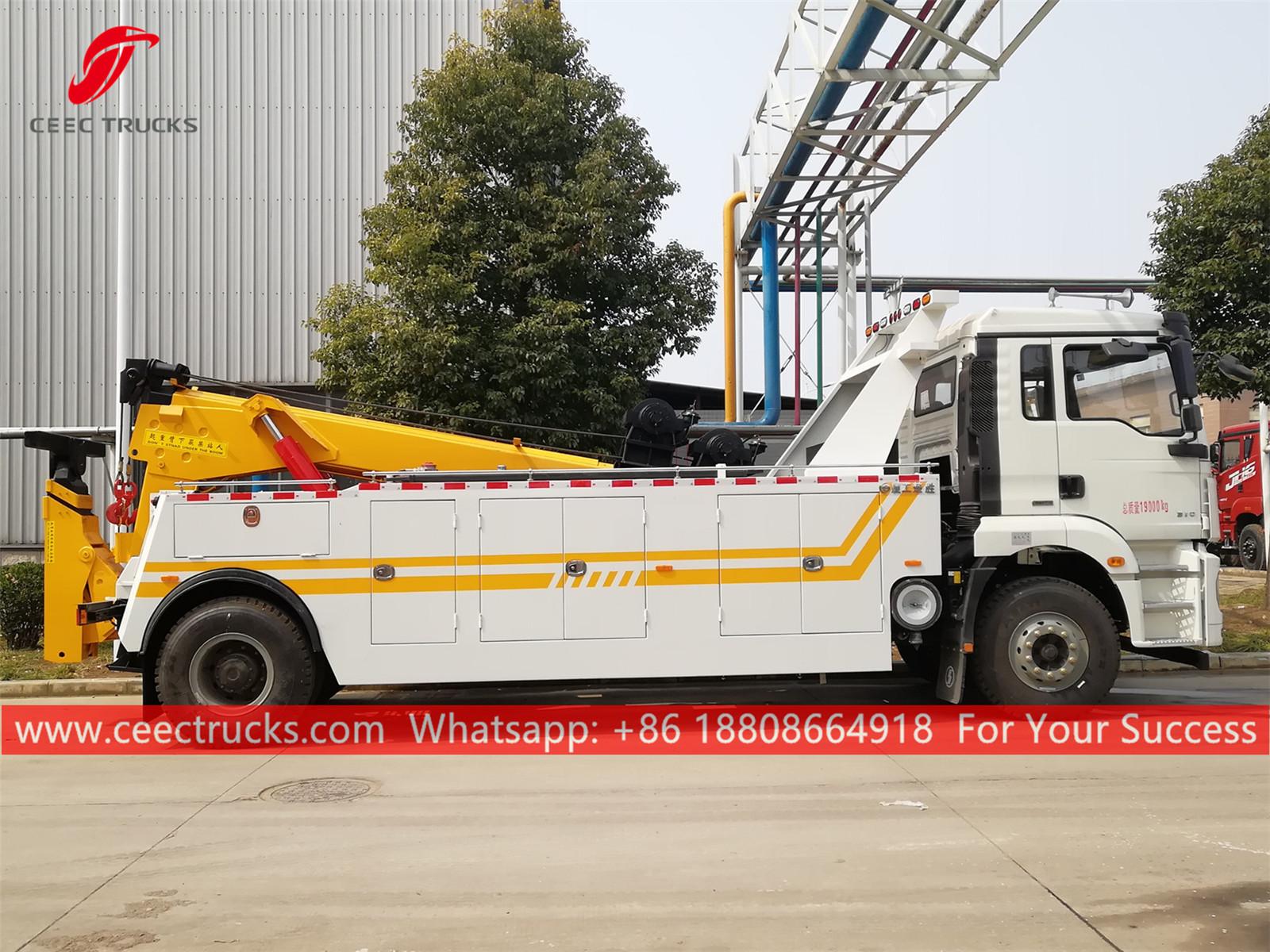СХАЦМАН 12тонс ревцовери камион, СХАЦМАН 4к2 шасија, БРЗИ 9-степени мењач, ВЕИЦХАИ 300ХП дизел мотор, дизалица са хидрауличним цилиндром ради, фарбање и логотипи зависе од захтева.