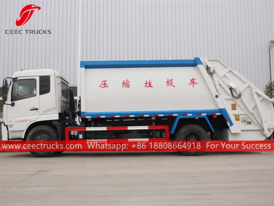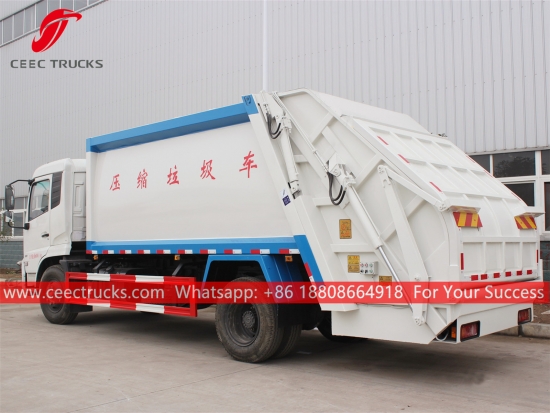 Камион са компресором за смеће марке Донгфенг 14 кубних метара, шасија камиона користи дизел мотор ЦУММИНС од 190 КС, ручни мењач са 6 брзина. ПЛЦ контролна кутија Сиеменс технологије за лак рад, све боје и логотипи на основу захтева клијената.