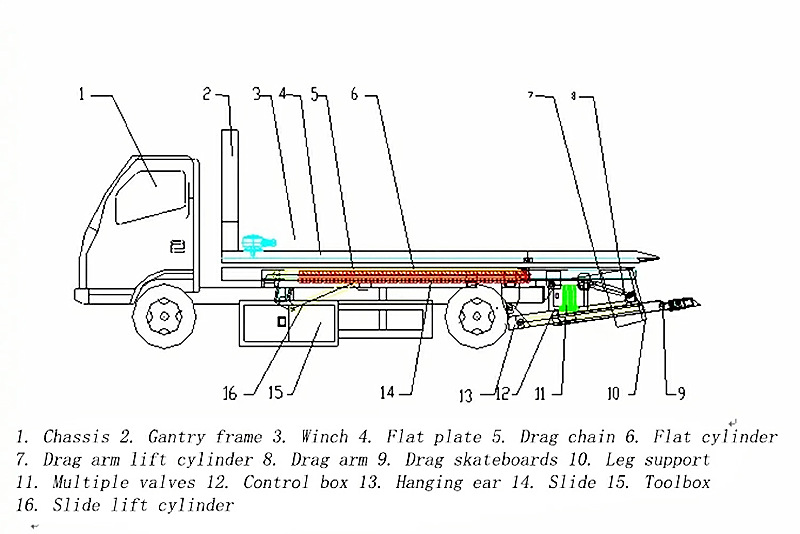 Комплет за горњи део каросерије камиона за вуку са равном платформом од 5 тона састоји се од хидрауличног система, рама за вучу, телескопске руке, челичног ужета и куке за вучу. Хидраулични систем покреће рам за вучу, телескопску руку и носећи оквир, омогућавајући брзо и поуздано вучење, подизање и друге операције. Челично уже и кука за вучу раде заједно како би лако одвукли оштећено возило до задњег дела камиона за вучу, осигуравајући безбедност током транспорта.