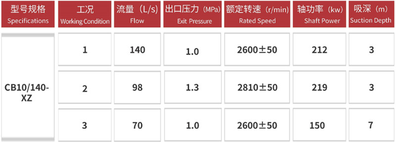 Ова пумпа има номинални проток од 70 до 140 л/с, номинални притисак од приближно 1,0 МПа и максимални вис од преко 100 метара. Одликује се брзим покретањем, великом усисном висином и стабилним снабдевањем водом. Њен снажан усисни капацитет омогућава брзо самоусисавање (до висине од приближно 7 м када се користи са уређајем за вакуумско преусмеравање воде).