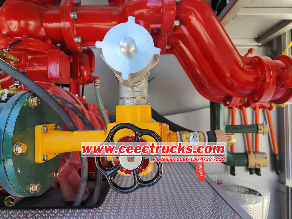 У ватрогасном возилу, ватрогасна пумпа се обично користи у комбинацији са резервоаром за воду, воденим топовима, цревима и другом ватрогасном опремом како би се формирао комплетан систем за гашење пожара. Када дође до пожара, ватрогасна пумпа се може брзо покренути, под притиском воде из извора и испоручити је до воденог топа или црева, који затим прскају воду на пожариште како би угасили ватру. Стога су перформансе и поузданост ватрогасне пумпе директно повезане са способношћу и ефикасношћу ватрогасног возила.