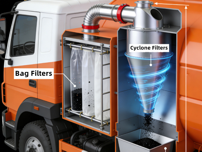 The filtration system is another advantage of CEEC. Its diverse designs include various filtration systems such as bag filters and cyclone filters, as well as dry and wet vacuum trucks. This means that the most suitable high-power suction technology can be matched according to the customer's specific operating conditions (such as material properties, humidity, particle size, and safety requirements) to maximize efficiency and minimize risk.