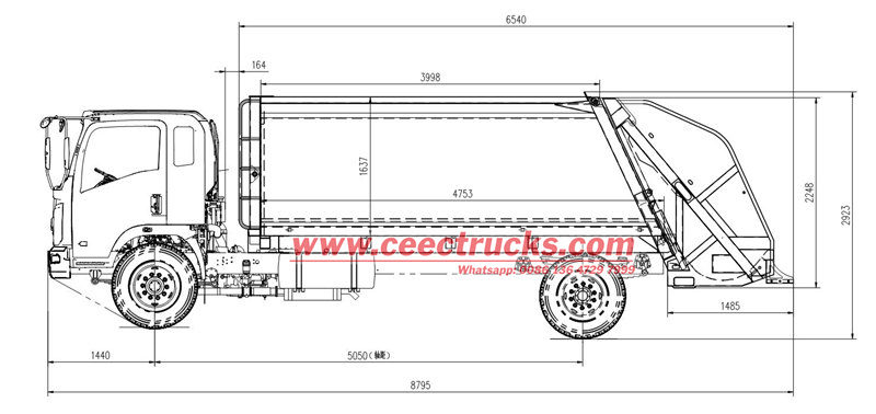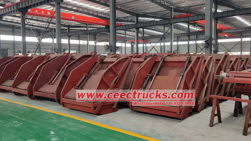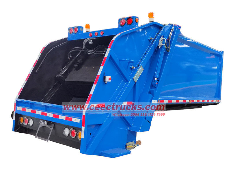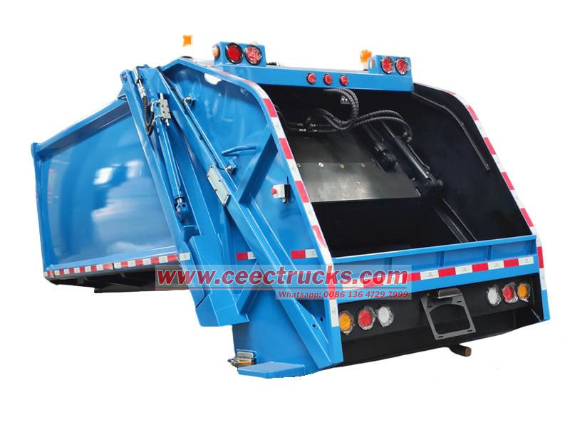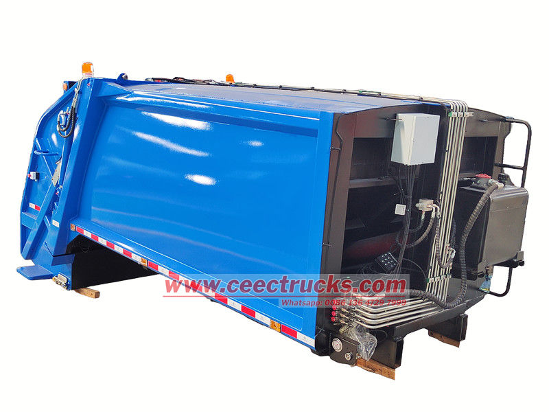 Тело задњег утоваривача отпада од 10 кубних метара састоји се од затвореног одељка, потискивача, утоваривача, хидрауличног система и електронског система управљања. Одељак користи ојачане греде заварене за челичне плоче, са унутрашњим клизним вођицама за клизање и истовар потискивача. Хидраулични систем контролише кретање сваког цилиндра, док електронски систем управљања омогућава аутоматизовани рад, обезбеђујући ефикасан и затворен рад током целог процеса сакупљања, компресије и транспорта отпада, спречавајући секундарну контаминацију.