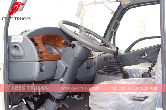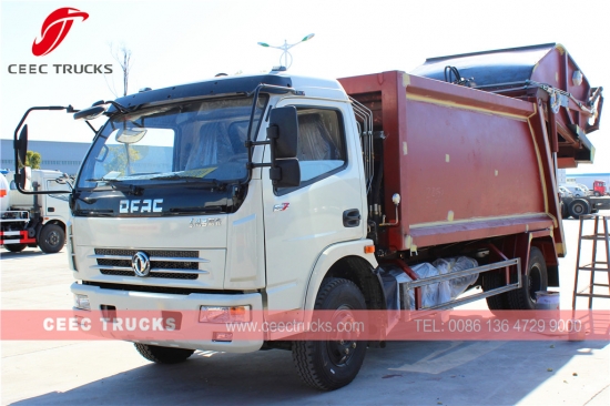 Донгфенг 8000Л камион за набијање смећа, који користи дизел мотор ЦХАОЦХАИ 120 КС, ручни мењач са 5 брзина, цистерна за набијање смећа високе чврстоће челичног материјала може бити до 8 кубних метара, Немачка ПЛЦ лака контрола, фарбање и логотипи зависе од захтева.