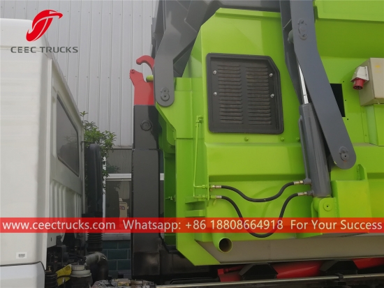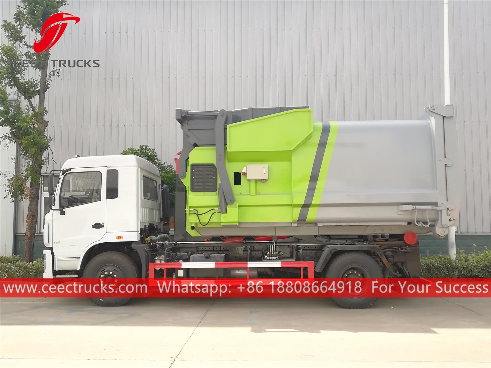 Хоок Лоадер Васте Цомпацтор Камион Донгфенг (такође се зоверолл он ролл офф камион за смеће, камион са куком за подизање контејнера, возило за одвоз смећа са куком за подизање смећа, утоваривач са куком на врућу продају, утоваривач на куку са одвојивим контејнером за смеће, камион за сакупљање отпада, камион за прикупљање смећа са куком за подизање) је дизајниран за сакупљање и транспорт комуналног чврстог отпада, који се широко користи у резиденцијалној заједници, болници, општинском еколошком одељењу, станици за сакупљање смећа и транспорту итд.