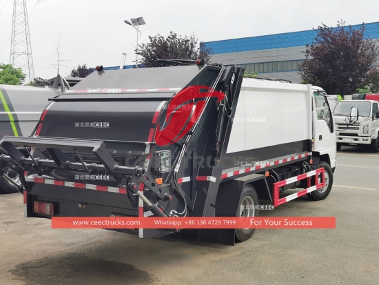 ИСУЗУ 4А—2 4цбм камион за смеће са задњим оптерећењем, шасија лаких камиона ИСУЗУ ЕЛФ 100П, опремљен са ИСУЗУ 98ХП дизел мотором, МСБ 5-степени мењач. Челични компактор високе чврстоће отпоран на хабање, ЦАН-бус систем управљања за лак рад. Све слике и логотипи на основу захтева клијената.