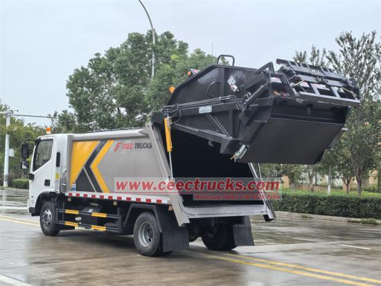 Камион са задњим утоваривачем FOTON 4x2 је специјално дизајнирано и прилагођено возило за сабијање смећа са задњим утоваром, које се користи за сакупљање, компресију и транспорт смећа. Опремљен је америчким дизел мотором марке CUMMINS ISF3.8s3141, модела ISF3.8s3141, са ефикасном снагом од 141 КС и емисијом од 3800 мл, четвороцилиндричним, водено хлађеним, четворотактним мотором, са кочењем издувним вентилом, директним убризгавањем, компресорским интеркулером и турбопуњачем, пружа снажну снагу. Упарен је са мануелним мењачем са 6 брзина, 6 брзина напред и 1 брзином уназад. Дизајниран је са комплетом каросерије запремине 10000 литара, потпуно хидрауличним радним уређајем и системом управљања, што чини камион за сабијање смећа Foton капацитета 10 кубних метара идеалним возилом за управљање смећем у земљама Јужне Америке.