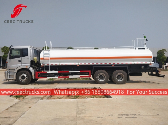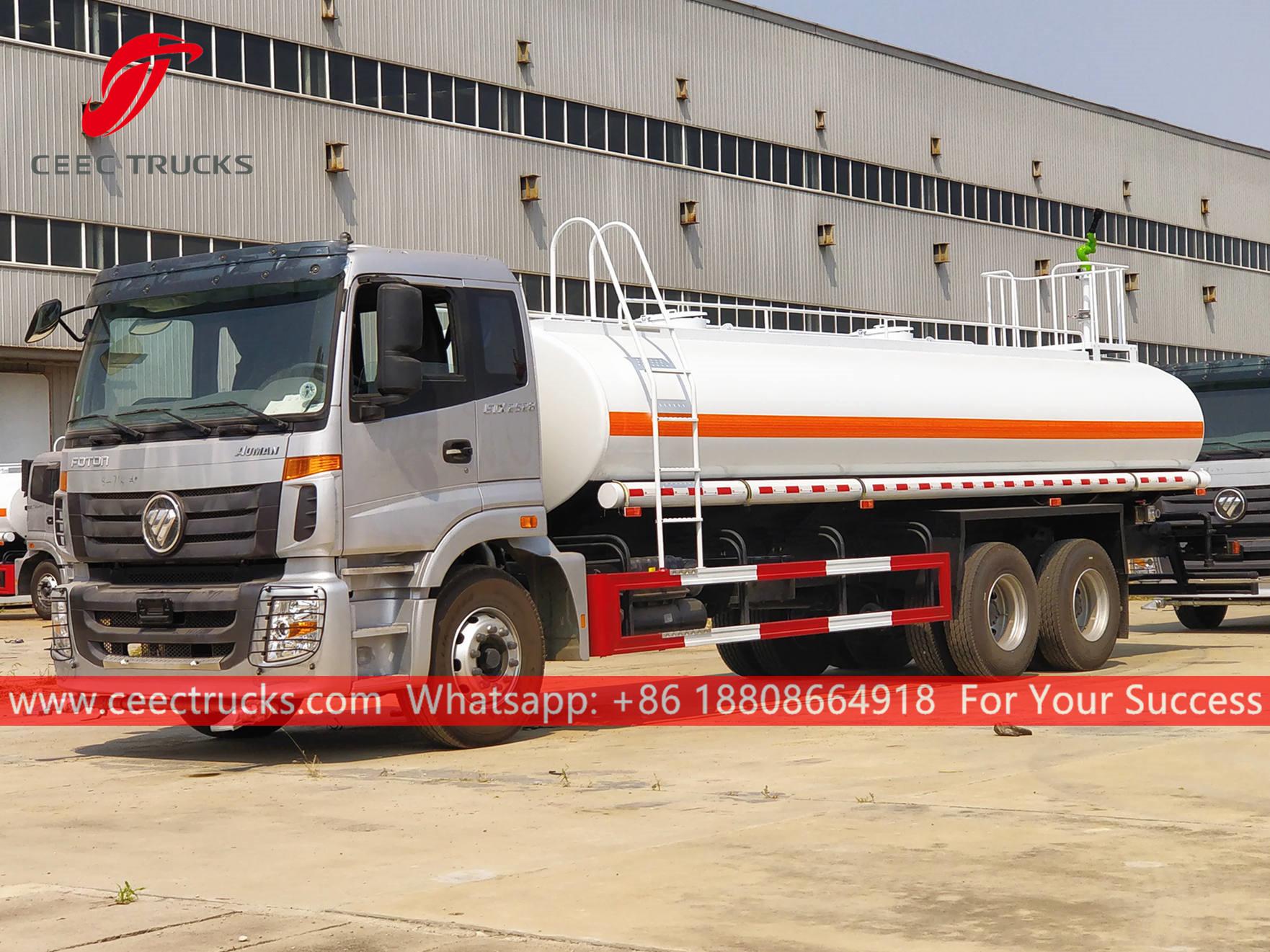 Камион за воду ФОТОН 15.000Л, шасија са воланом на левој страни ФОТОН 6к4, ручни мењач са 8 брзина, дизел мотор ЦУММИНС 270 КС, водена пумпа познатог бренда, са предњом, средњом и задњом млазницом за прскање по избору. Све слике и логотипи зависе од захтева.