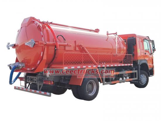 Цистерна за чишћење канализације Howo од 10 кубних метара базирана је на шасији Howo 4x2, међуосовинском растојању 4600, опремљена је дизел мотором WP10.300E22 од 300 КС и мењачем HW13710, управљачким механизмом ZF8198, емисијом дизела Euro 3 од 9.726L, гумама 295/80R22.5 са укупно 7 комада, што је снажан и једноставан за руковање. Користи кућиште резервоара од висококвалитетног угљеничног челика и опремљен је вакуум пумпом високих перформанси. Има функције самоусисавања, самопражњења и самопражњења. Има снажно усисавање и високу ефикасност, тело резервоара се може брзо напунити и ефикасно испразнити у једној операцији.