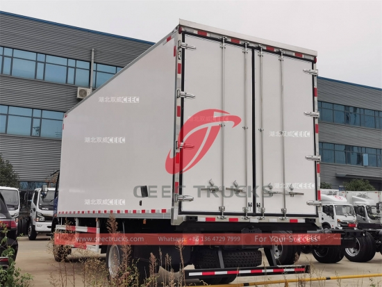 а–¶Структура каросерије хладњача је сендвич структура: Фиберглас + ПУ + фиберглас.Све дупле површине сендвич полиуретанске плоче и врата су100ммдебљина, дебљина плоче од фибергласа је2.5ммза спољашњу и унутрашњу кожу; густина полиуретанске пене је 45-50кг/м3. (Све је најбољи материјал у Кини и има одличне перформансе изолације).