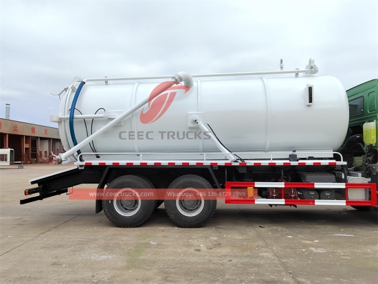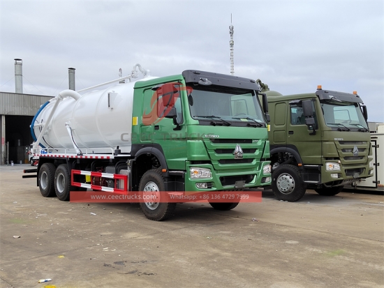 400хп ХОВО 20000Л вакуум камион за отпадну воду извоз у Африку, ВЕИЦХАИ 400ХП дизел мотор, ХВ19710 ручни мењач са 10 брзина, цистерна за материјал од угљеничног челика високе чврстоће, капацитет може бити 16000 до 20000 литара. Позната кинеска вакуумска пумпа ВЕИЛОНГ и увезена ЈУРОП / БП / МОРО вакуум пумпа за опцију, хидраулични уређај за подизање за испуштање отпада, фарбање и логотипи зависе од захтева.
