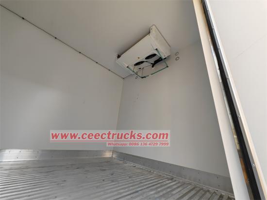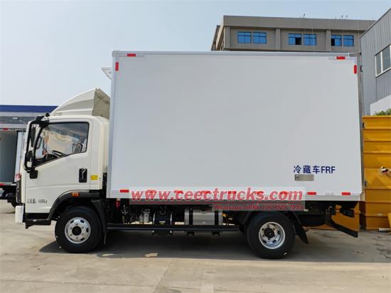 Хладњача HOWO 4x2, модификована на шасији лаког камиона серије HOWO Leader, међуосовинско растојање од 3360 мм, опремљена мотором Weichai WP3NQ160E61 од 160 коњских снага, 6-степеним мењачем Xingrui ML650A, горњом расхладном каросеријом 4100×2300×Величина 2050 мм, материјал од фибергласа, FRP + PU пена + FRP материјал панела дебљине 105 мм, потпуно затворени сендвич панел, десна бочна врата, двострука задња врата пуне величине, под отпоран на клизање и хабање, Carrier CITIMAX D6 независна расхладна јединица.