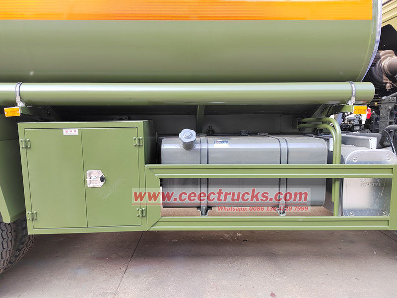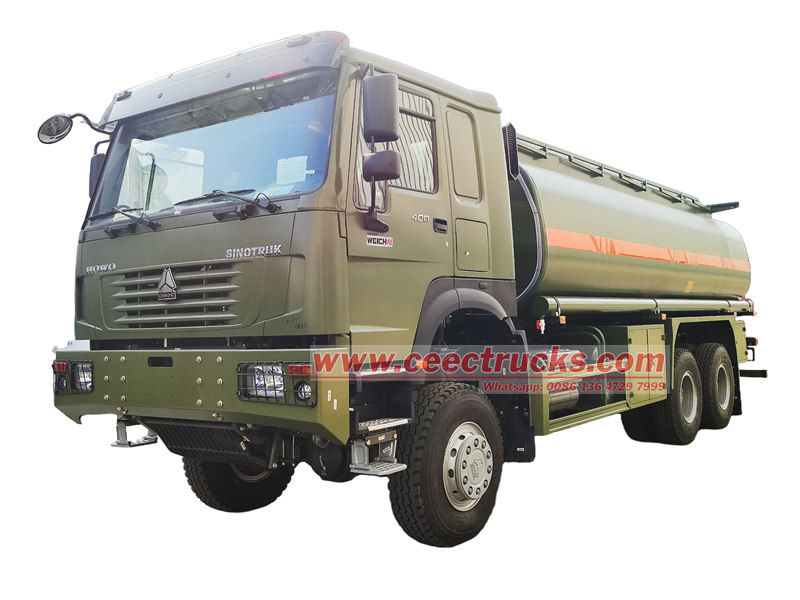 Војни мобилни камион за пуњење горива HOWO 6x6 базиран је на шасији HOWO 6x6, опремљен је дизел мотором WP12.400E22 од 400 КС и мењачем HW19710, гумама 12.00R20 и управљачким механизмом ZF8118, који је моћан и једноставан за руковање. Било да је у питању градилиште, удаљени пут, аеродром или рудник, камион за пуњење горива може флексибилно стићи, благовремено напунити опрему горивом и осигурати нормалан рад производње и животног века.
