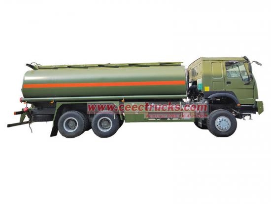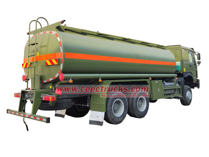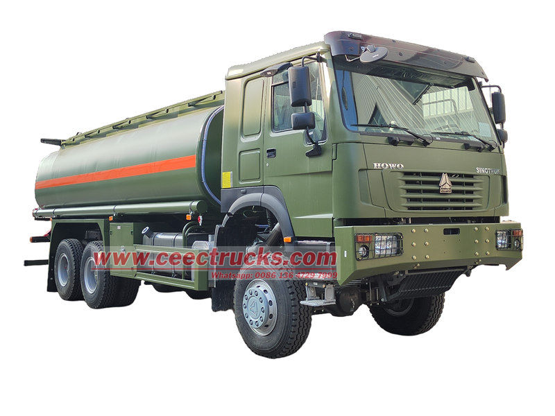 4x4 8x8 drive avaiableВојни мобилни камион за точење горива HOWO 6x6, такође познат као камион-цистерна за нафту, је важна опрема за транспорт и снабдевање горивом. Заснован на шасији камиона, опремљен је великим резервоаром за складиштење нафте. Резервоар је чврст и добро затворен и може да складишти велику количину горива. Возило је опремљено основном опремом као што су систем за пумпање и машина за пуњење горива, која може прецизно и ефикасно да испоручује гориво различитим возилима, инжењерској опреми или машинама. Истовремено, ради безбедности, Мобилни камион за гориво HOWO Такође је опремљен антистатичким уређајем, вентилом за дисање, апаратом за гашење пожара итд.