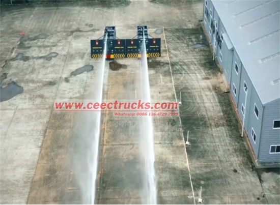 ● Комплетно прскање возила под високим притиском: 6 група млазница за пену под високим притиском је распоређено на крову и 4 групе млазница за пену под високим притиском су распоређене на шасији, са радним притиском од 1,2 MPa и протоком једне млазнице од 15 л/мин, покривајући слепу зону гашења пожарацело возило у року од 30 секунди.