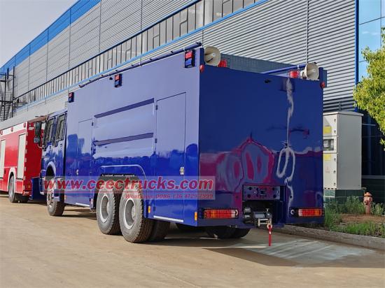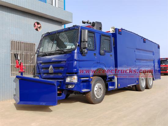 Камион са воденим топом отпорним на експлозију HOWO 6x4 је модификован на бази шасије са дворедном кабином HOWO HW76, са међуосовинским растојањем од 4600+1350 мм, опремљен је мотором WP10H400E60 и мењачем HW15710. Возило је опремљено кутијом отпорном на експлозију, главним топом на врху и предњим помоћним воденим топом на челу, што омогућава свеобухватну контролу нереда великог протока и на велике удаљености; кабина са дворедним возилом, 6 путника; укључујући резервоар за воду: 12000л, резервоар за пену: 100л, резервоар за боју: 100л, резервоар за воду са бибером: 100л, опремљен је противпожарном пумпом CB10/60, предњи део возила је опремљен челичном плочом отпорном на нереде и јаком хидрауличном челичном лопатом за чишћење препрека; лампе и прозорска стакла су заштићени мрежом од нерђајућег челика.