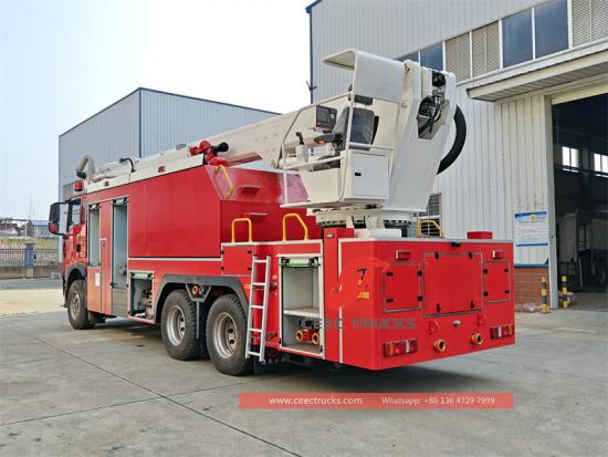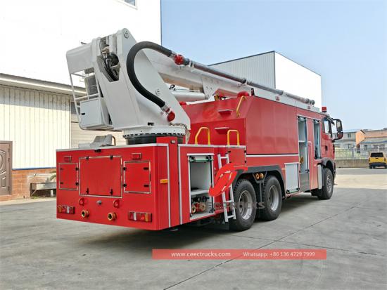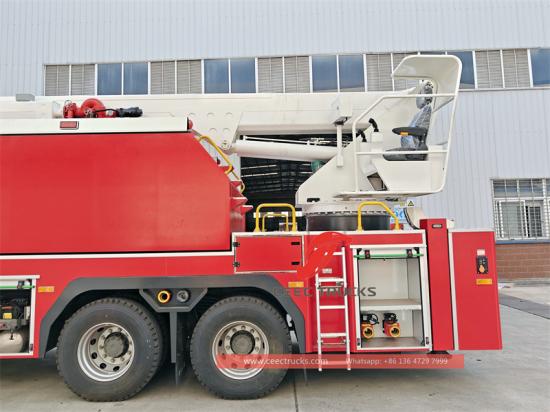 Хаво ватрогасни камион са високим дизањем је модификован од кинеске Хово шасије за тешке услове, са снажном снагом и напредном конфигурацијом. Извод снаге је оригинални извод снаге на шасији, који има најбоље усклађивање снаге. Подоквир има кутијасту структуру великог пресека са добром отпорношћу на торзију, подупирач има структуру у облику слова Х кратког распона, а рука има комбинацију склопивих руку, која се креће брзо и глатко. Окретни део је опремљен централним закретним зглобом који може да постигне неограничен угао окретања од 360 степени. Ватрогасно возило са високим дизањем Хово опремљено је ватрогасном пумпом великог протока и монитором за пожар, а резервоар за воду и водени пут су направљени од висококвалитетног нерђајућег челика и цеви од легуре алуминијума високе чврстоће. Хидраулички систем усваја пумпу високих перформанси и пропорционални режим електричне и течности. Електрични систем усваја зрелу и поуздану комуникацијску технологију ЦАН магистрале контролера и централизовани рад на више тачака. Тело усваја структуру коже од алуминијумске легуре отпорне на рђу, а кутија за опрему има структуру роло врата великог капацитета. Ватрогасни камион са високим дизањем Хово има комплетне пратеће објекте, који могу погодно да апсорбују воду из сопственог резервоара за воду, ватрогасног хидранта и рибњака, а такође могу да реализују релејно снабдевање водом. Интерфејси за излаз воде и убризгавање воде су распоређени симетрично на левој и десној страни тела, што у потпуности испуњава захтеве различитих локација.