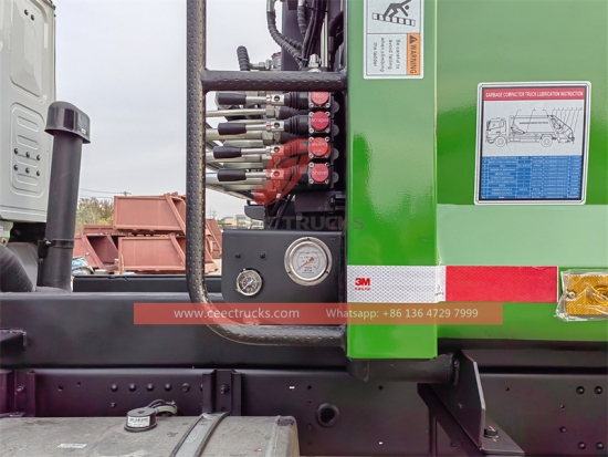 ЦЕЕЦ ТРУЦКС произведено тело компактора за смеће, са кутијом запремине 8 кубних метара, задњим са уређајем за окретање канте за отпатке, може преокренути канте за отпад од 120Л/240Л/660Л/1100Л, контролна табла+ручна ручица+унутрашња контрола кабине. Нова равна каросерија аутомобила у облику лука, материјал каросерије је висококвалитетни угљенични челик од гвожђа и челика Вухан, ефективна запремина компресије је 8 кубних метара, контрола рада ПЛЦ-а са једним кључем, интегрисани режим рада лампе, двострука електрична контрола са обе стране, са радом кабине и ојачана подна подршка, двосмерна компресија, отварање и лако чишћење резервоара.