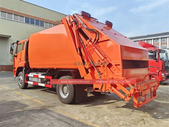 Камион за сабијање смећа Howo користи брзи мењач са 10 брзина за кретање напред и 2 брзине за кретање уназад. У комбинацији са чврстим оквиром и флексибилним управљањем, обезбеђује стабилан и ефикасан рад у сложеним условима на путу. 15 ЦБМ Закривљени резервоар, направљен од специјалног челика Q235 дебљине 4 мм, користи процес обликовања из једног дела, што резултира односом компресије од 1:3,4, обезбеђујући врхунску ефикасност сабијања смећа. Његов потпуно аутоматски хидраулични систем управљања смањује циклусе утовара и истовара на 40-45 секунди. Опремљен интелигентним PLC системом управљања, једноставан је и брз за руковање. У ручном режиму, оператер може користити ручицу за управљање и електричне контролне дугмад за завршетак компресије, истовара и других операција одељка за смеће.