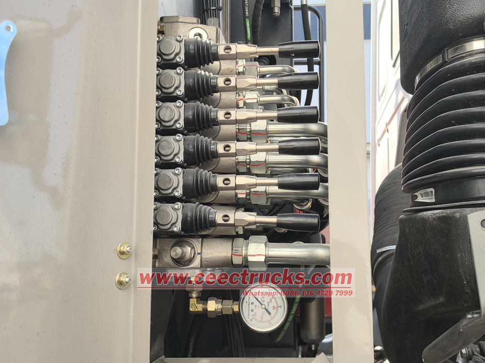 ● Камион за смеће са задњим утоваривачем HOWO ослања се на мотор да би обезбедио снагу, која се преноси на пумпу за уље преко извода снаге и мењачког вратила. Пумпа за уље се окреће да би генерисала уље под високим притиском. Оператор контролише прекидач на вишесмерном обртајућем вентилу како би хидраулично уље покренуло одговарајући цилиндар, а затим покреће одговарајући механизам да би завршио операцију.