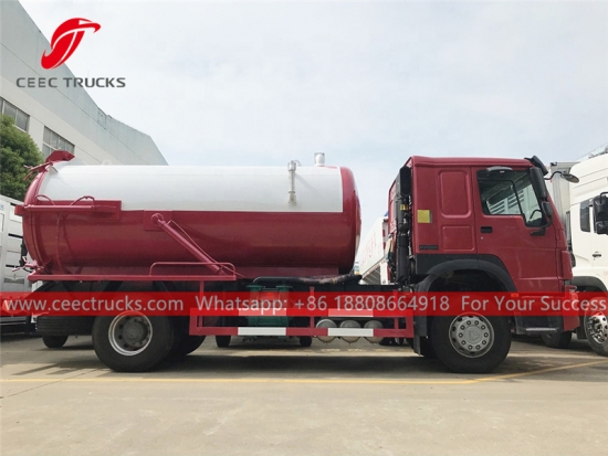ХОВО 6 точка Вакуум камион (такођезовеКамион цистерна вакум ХОВО, ХОВО 6-точкаш камион за чишћење канализације, ХОВО Еуро3 вакумски усисни камион, ХОВО вакуумски усисивач, септички усисни камион ХОВО, ХОВО камион за усисавање канализације, ХОВО камион за третман отпадних вода)јекористи се за сакупљање, транспорт и испуштање течности као што су прљава вода, муљ, септичка, сирова нафта и чврсте ствари као што су ситно камење, цигле такође. Погодан је за чишћење канализације, септичке јаме, септичке јаме, сливника, итд. Широко се користи у области животне средине и санитације.