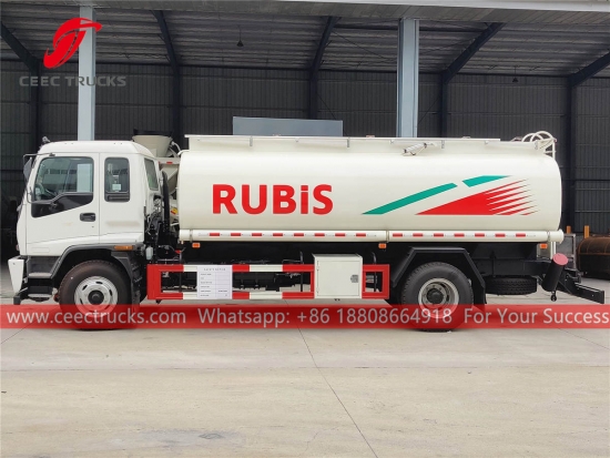 Камион за гориво ИСУЗУ 15цбм, шасија ИСУЗУ ФТР, ручни мењач са 6 брзина, дизел мотор ИСУЗУ 205ХП, стандардна цистерна за гориво, пумпа за уље познатог бренда као стандард. Све слике и логотипи зависе од захтева.