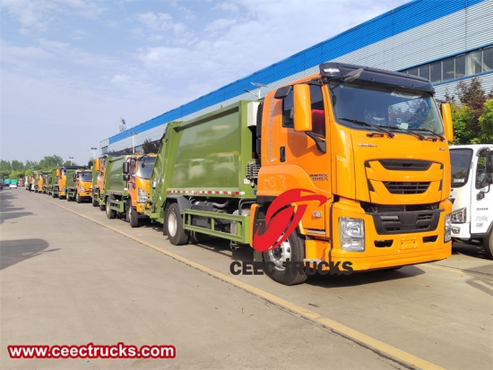 Исузу 15 цбм компактор отпада камион за смеће такође се назива и Исузу ГИГА 4Кс2 камион за сабијање отпада, Исузу ГИГА 5Кс шасија са кабином са задњим утоваривачем, Исузу ГИГА 15 кубних метара камиона за одлагање смећа, Исузу ГИГА 4к2 камион за сакупљање отпада, Исузу ГИГА 15цбм камион са компресором за отпад, је професионално возило дизајнирано за ефикасно одлагање отпада. Има ултра-велики капацитет од 15 кубних метара и усваја напредну технологију компресије са задњим пуњењем, која може брзо да компримује и утовари велике количине смећа, смањује број времена транспорта и побољшава ефикасност рада.