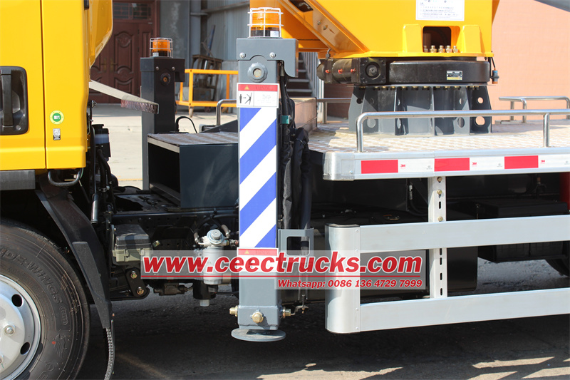 ОвоИсузу на шасији камиона 20м зглобна радна платформаима 4 подножја која се могу продужити, што погодује бољем пријањању на подлогу и омогућава модулацију загушења на путу. Можете додати опције као што су комплет за сигнализацију укључујући жироскоп и трифласх, пад-страну, сандуке или заштиту високог нивоа.