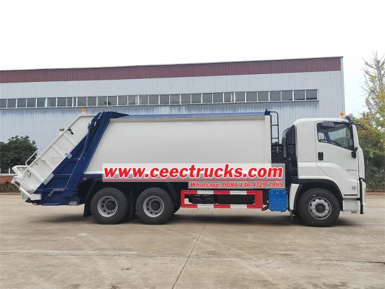 Исузу 25 цбм тешки задњи утоваривач усваја Исузу ГИГА ВЦ61 6Кс4 шасију кабине, опремљен УСБ интерфејсом радиом и клима уређајем, међуосовинско растојање 4600+1370 мм, мотор 6УЗ1-ТЦГ61 380 КС, БРЗИ 12-брзински мењач, каросерија је 839 м, мењач је 839 евра Тело кутије за смеће у облику лука од 25 м3, направљено од угљеничног челика, са дебљином страница 4 и дна 5, третманом против рђе изнутра и споља, и усваја електронски контролни систем ЦАН-БУС и систем управљања хидрауличним вентилом.