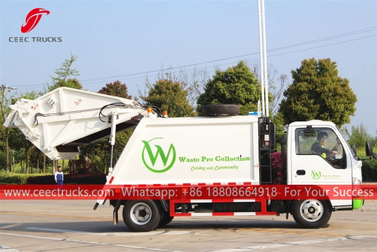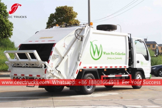 ИСУЗУ 5м3Камион за смеће са задњим утоваривачем, шасија камиона користи ИСУЗУ 98ХП дизел мотор, МСБ мењач са 5 брзина. ПЛЦ контролна кутија за лак рад. Све слике и логотипи на основу захтева купаца.