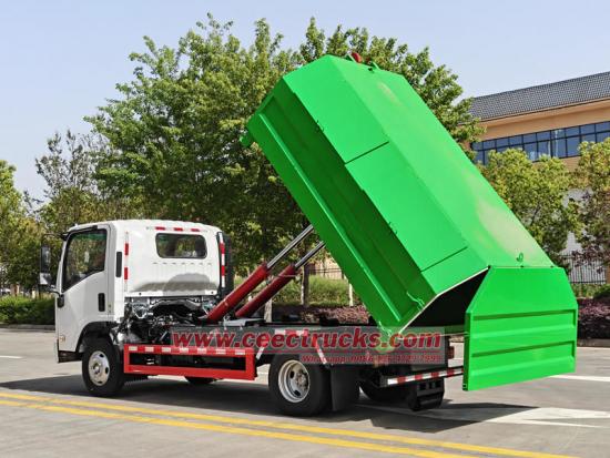 Карактеристике: Камион за смеће са куком Исузу ЕЛФ има предности разумне структуре, једноставног руковања, стабилности и ефикасности, добрих перформанси заптивања и практичног одлагања.