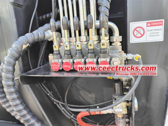 •истовар:На станици за одлагање смећа или на депонији, возач спушта ручицу куке и поставља контејнер за смеће у предвиђени положај кроз супротну операцију, а затим искључује везу да би завршио процес истовара.