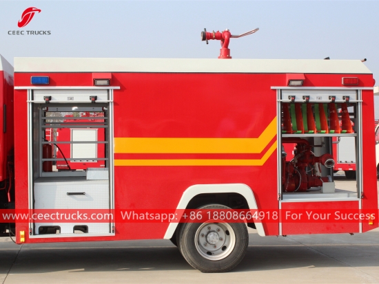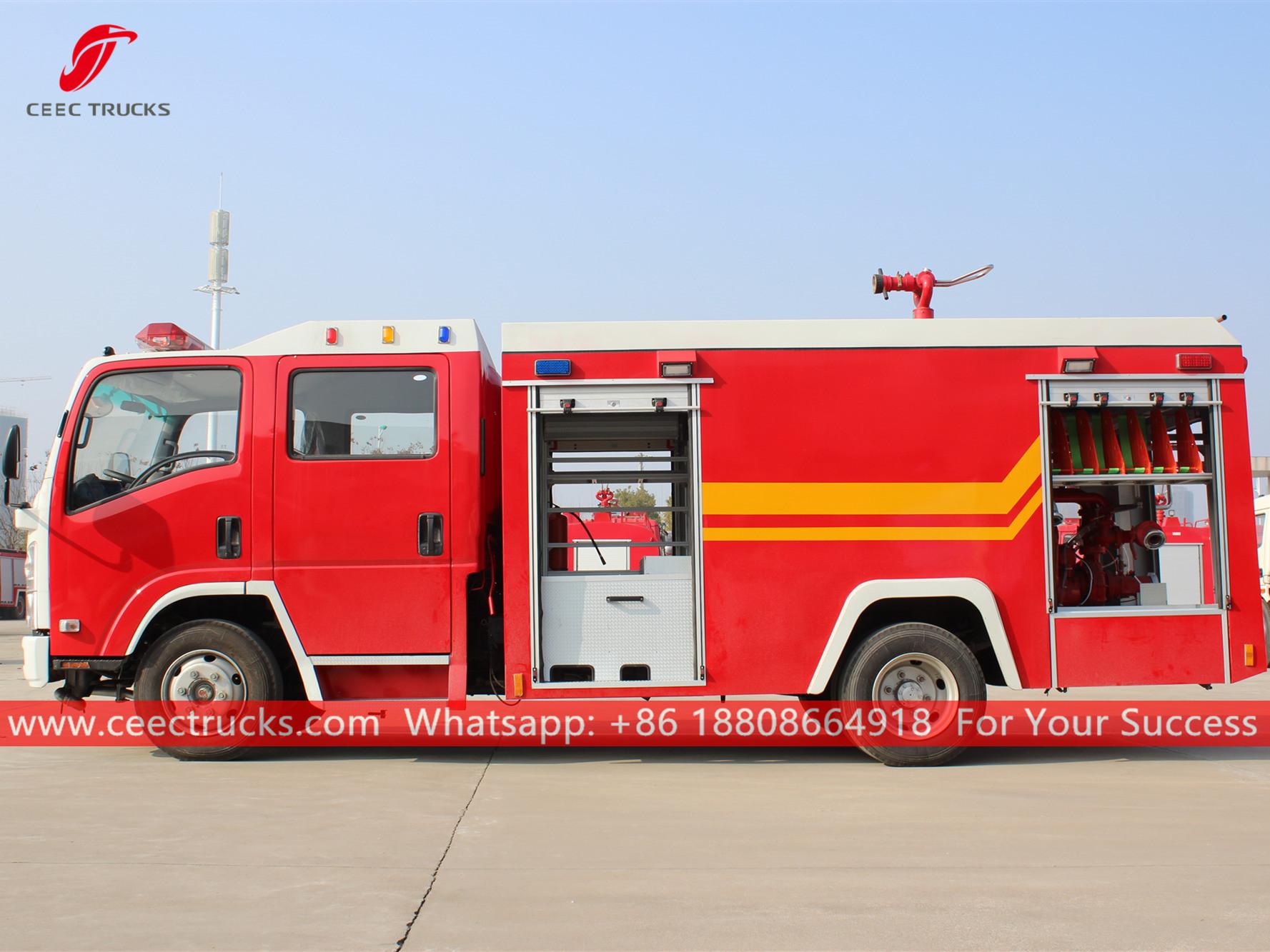 Ватрогасно возило са резервоаром за воду ИСУЗУ 5ЦБМ, користите шасију ИСУЗУ ЕЛФ Лефт Ханд Дриве модела 4к2, ручни мењач са 6 брзина, дизел мотор ИСУЗУ 190 КС, капацитет цистерне за воду 5.000 литара, фарбање и логотипи зависе од захтева.