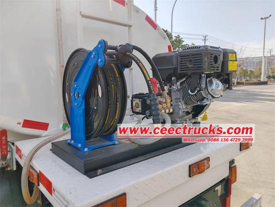 Предњи спреј, налази се радна платформа на задњем делу возила, опремљена чистачем под високим притиском и воденим пиштољем високог притиска, који се може подесити према потребама, и опремљен висококвалитетном пумпом за прскање, опремљен противпожарним интерфејсом и преливним вентилом, са функцијом самоусисавања. |