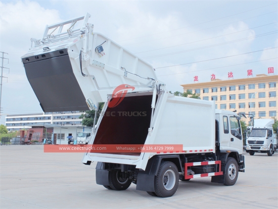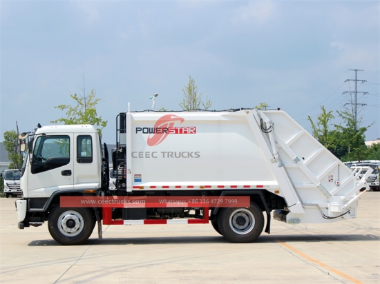 ИСУЗУ ФТР камиони за набијање смећа 10 ЦБМ извоз у Дубаи, ИСУЗУ 6ХК1 мотор, са 205 КС, МЛД 6-степени ручни мењач за лак рад. Најквалитетнији ИСУЗУ модел шасија 10 ЦБМ камиони са компресором за смеће широко извозе Дубаи за препродају