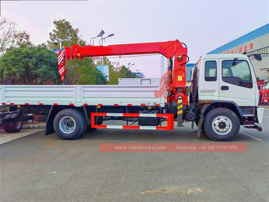 ИСУЗУ ФТР 5 тона камион кран, ИСУЗУ ФТР 4×2 шасија са леве стране, 6-степени мануелни мењач, дизел мотор ИСУЗУ 205ХП, телескопска дизалица познатог кинеског бренда од 5 тона, димензија каросерије по потреби, сликање и логотипи зависе од захтева.