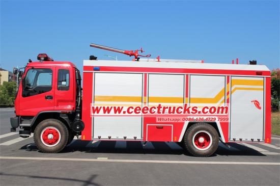 Тхе Исузу ФВР резервоар за воду и ватрогасно возило са сувим прахом имају мултифункционалне перформансе, са укупном телесном тежином од 18.000 кг, погонским системом 4к2 и 6ХК1-ТЦГ61 дизел мотор снаге 221 киловат и максималне брзине од 90 км/х. Возило је опремљено резервоаром за воду од 4 кубна метра и2000Л резервоар сувог праха, као и ватрогасна пумпа ЦБ10/40 са радним притиском од 1~4 МПа и протоком од 40 литара у секунди. Поред тога, возило је опремљено и воденим топом ПС 40вЊегов радни опсег до 55 метара, и радни углови од -30° до 80°, задовољавајући различите потребе гашења пожара. Истовремено, камион може бити опремљен и резервоарима од различитих материјала, који се по потреби могу поделити у више преграда, а може бити опремљен и пумпама различитих познатих брендова, што има високу флексибилност и применљивост.