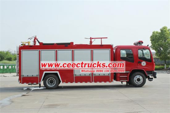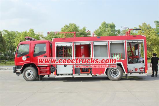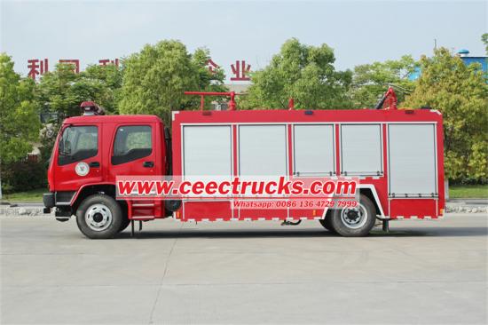 Тхе Исузу ФВР резервоар за воду и ватрогасно возило са сувим прахом имају мултифункционалне перформансе, са укупном телесном тежином од 18.000 кг, погонским системом 4к2 и 6ХК1-ТЦГ61 дизел мотор снаге 221 киловат и максималне брзине од 90 км/х. Возило је опремљено резервоаром за воду од 4 кубна метра и2000кг резервоар сувог праха, као и ватрогасна пумпа ЦБ10/40 са радним притиском од 1~4 МПа и протоком од 40 литара у секунди. Поред тога, возило је опремљено и воденим топом ПС 40 и ПФ 30 суви прах топ, са радним дометима до 55 метара и13метара и радним угловима од -30° до 80°, задовољавајући различите потребе за гашење пожара. Истовремено, камион може бити опремљен и резервоарима од различитих материјала, који се по потреби могу поделити у више преграда, а може бити опремљен и пумпама различитих познатих брендова, што има високу флексибилност и применљивост.