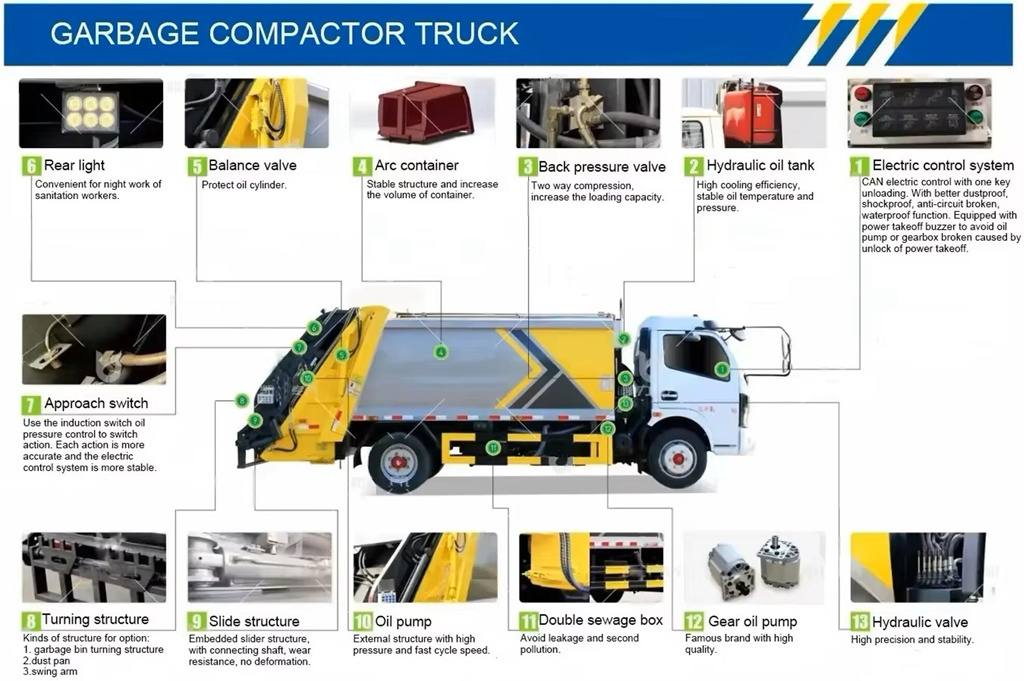 Исузу 10цбм компактор за смеће камионпроизводи ЦЕЕЦ ТРУЦКС опремљен је Исузу 4к2 ГИГА 4Кс моделом ФТР Еуро 6 камионском шасијом, Исузу 205ХП 4ХК1-ТЦГ60 модел дизел мотором, Еуро 6 стандардом запремине 5193цц, међуосовинским растојањем 4500мм, 2+1 седиштима са 2+1 седиштима са унутрашњом кабином за ваздушну кочницу, АБС системом кочнице 4 4-тактни дизел мотор, помоћ у правцу. Камион има 3 режима рада, укључујући ЦАН-БУС електричну контролу у кабини, хидраулични џојстик, ЦАН-БУС електричну контролну кутију у резервоару за врата пртљажника, такође задњи нагибни уређај се може прилагодити за утовар канте од 240Л и 1100Л, доступне су и пластичне канте и металне канте.