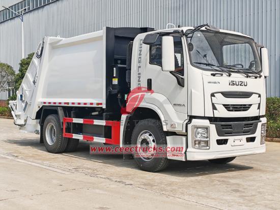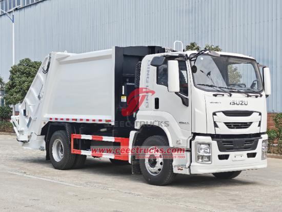 Камион за смеће Isuzu 10cbm са задњим утоваривачем и уређајем за сабијањеПроизведено од стране CEEC TRUCKS, опремљено је шасијом камиона Isuzu 4x2 GIGA 4X модел FTR Euro 6, Isuzu дизел мотором модела 205HP 4HK1-TCG60, стандардом емисије Euro 6 са запремином од 5193cc, погодно за све купце широм света, међуосовинским растојањем од 4500mm, 2+1 седиштем са клима уређајем у кабини, ваздушним кочницама са ABS-ом, редним 4-цилиндричним 4-тактним дизел мотором, помоћи при управљању правцем. Камион са задњим утоваривачем има 3 режима рада, укључујући CAN-BUS електричну контролу у кабини, хидраулични џојстик иза кабине камиона, CAN-BUS електричну контролну кутију у левом резервоару, такође се уређај за задње нагињање може прилагодити за утовар контејнера од 240L, 360L, 660L, 770L и 1100L, доступне су и пластичне и металне контејнери.