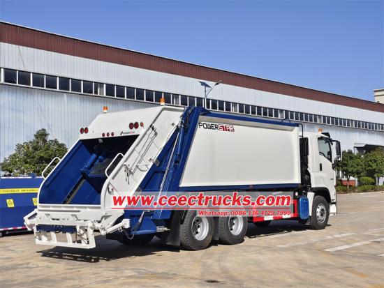 Isuzu VC61 6x4 cabin,large capacity garbage binИсузу гига 6УЗ1 мотор задњи утоваривач камион за рециклажу, као тешко транспортно возило дизајнирано за ефикасно градско одлагање смећа, 6к4 компримовани камион за смеће користи софистицирани систем компресије који покреће хидраулични цилиндри за ефикасно компактирање отпада, максимизирајући капацитет утовара. Поседује разноврсне команде, укључујући електрични рад у кабини и ручне/електричне опције на вратима пртљажника, пружајући руковаоцима флексибилност и лакоћу коришћења.