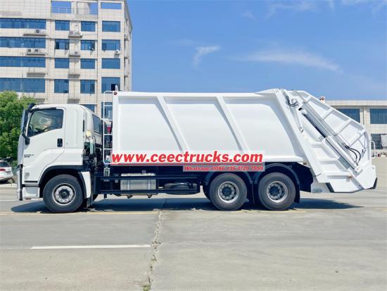 ТхеИСУЗУ ГИГА компактор за смеће камион усваја напредни 12 фронт и2 задњи мењач, у комбинацији са а6*4 погонски облик како би се осигурала стабилност и ефикасност у сложеним условима на путу. 25ЦБМ закривљено тело резервоара је направљено од специјалног челика К235, са дебљином тела резервоара од 4 мм и укупним процесом обликовања. Цомпглумац однос је чак 1:3,4, обезбеђујући крајњи компглумац ефикасност. Потпуно аутоматски хидраулички контролни систем има једно време циклуса пуњења и истовара од само 40-45 секунди, и опремљен је интелигентном контролом ПЛЦ-а, којом се лако и брзо управља. У ручном режиму, оператер може да користи ручицу за управљање и електрична контролна дугмад да заврши операције као што је компглумаци истовар простора за смеће.