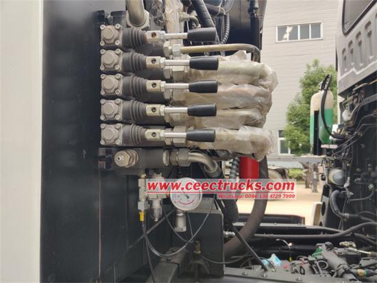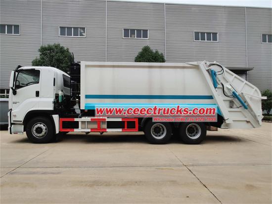 ИСУЗУ ГИГА камион за набијање смећа има напредни 12 предњих и 1 задњи мењач, комбинован са погоном 6*4 како би се обезбедила стабилност и ефикасност у сложеним условима на путу. Закривљено тело резервоара од 20ЦБМ је направљено од специјалног челика К235, са дебљином тела резервоара од 4мм и целокупним процесом обликовања. Однос компресије је чак 1:3,4, осигуравајући крајњу ефикасност компресије смећа. Потпуно аутоматски хидраулички контролни систем има једно време циклуса пуњења и истовара од само 40-45 секунди, и опремљен је интелигентном контролом ПЛЦ-а, којом се лако и брзо управља. У ручном режиму, руковалац може да користи ручицу за управљање и електрична контролна дугмад да заврши операције као што су компресија и истовар одељка за смеће.