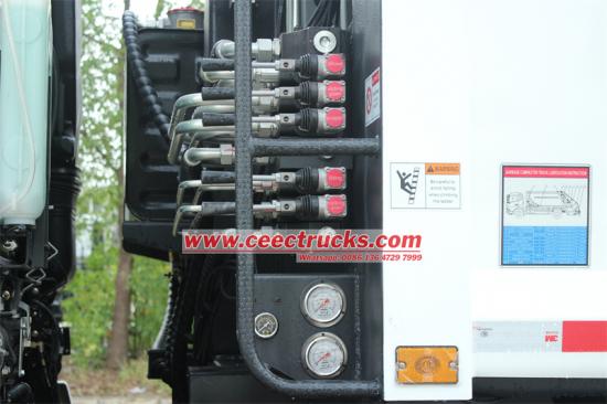——Хидраулични систем:Састоји се од резервоара за гориво, пумпе за уље, вишесмерног вентила, хидрауличног цилиндра, цевовода итд. Хидраулички притисак је обично подешен на 16Мпа, а снага се добија од мотора преко прикључка за погон за утовар и истовар, компресију, подизање и друге радње.