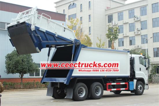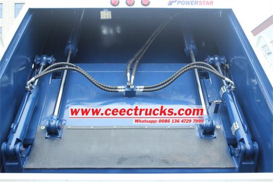 Горњи део ИСУЗУ ГИГА камиона за сабијање отпада има тело компактора направљено од специјалног челика високе чврстоће Т420 дебљине 5 мм, који обезбеђује издржљивост и носивост. Са односом компресије од 3,0:1, може ефикасно компримовати кабасти смеће у мању запремину, чиме се повећава ефикасност утовара. Дизајн хидрауличног механизма за подизање канте омогућава да возило удобно монтира две канте за смеће од 240Л за операције утовара. Циклуси утовара и истовара се контролишу у року од 25~30 секунди и 15~20 секунди, што значајно побољшава радну ефикасност. Дизајн резервоара за отпадну воду ефикасно решава проблем канализације која се ствара током процеса компресије смећа. Контролни систем усваја комбинацију ЦАН магистрале и хидрауличних контролних вентила, постижући прецизну контролу над процесом компресије.