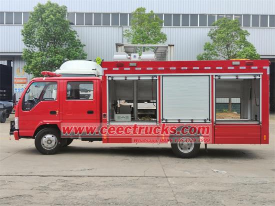 ИСУЗУ мини тип вишеструко функционално ватрогасно возило за спасавање, дворедна просторија за вожњу са 2+4 седишта, укључујући 4 СЦБА седишта, опремљена са 4КХ1ЦН6ЛБ дизел мотором са 88КВ и 120КС, МСБ ручним мењачем са 5 брзина са 5 напред и 1 уназад. Задњи део собе за посаду је модификован за гашење пожара, више чланова посаде, јака снага, добре механичке перформансе, структура и распоред су разумни, такође монтиран са телескопским уређајем за подизање осветљења, погодан рад и одржавање, у складу са захтевима ватре стварне борбе.